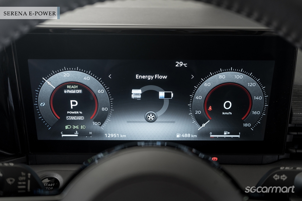 In rather old-school style, its instrument cluster retains analogue dials for the car's power meter and speedo too, flanking a 4.2-inch LCD display. The latter condenses all relevant information very sensibly, and is likewise logical to operate - but the digital-analogue combo remains less impressive than the Serena's full-digital route.