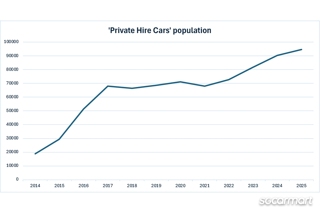 The population of cars classified by LTA as 'Private Hire Cars' has grown year-on-year since 2014. As of November 2025, at 94,711 the population is at its largest yet.