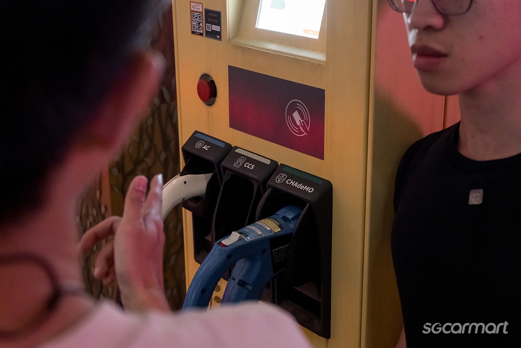The SP app makes no distinction between the two ports, so note that while there are two plugs in this location, there's a fair chance that the CCS one which you need to use will be occupied if the app tells you that one car is already making use of a DC plug. The JomCharge app, however, does inform you which of these plugs is being used so there's the option to refer to this if you really need to know if delays are to be expected.