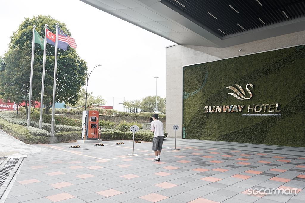 Our first targeted charging stop is at Sunway Hotel Big Box. Just close to 15km away from Tuas checkpoint, it's a perfect stop and charge point for those who have left Singapore without charging up the night before. There's two 60kW DC chargers here, and one of these is supposed to give us our first taste of booting up a foreign charger with the SP app. But it doesn't go quite as planned.