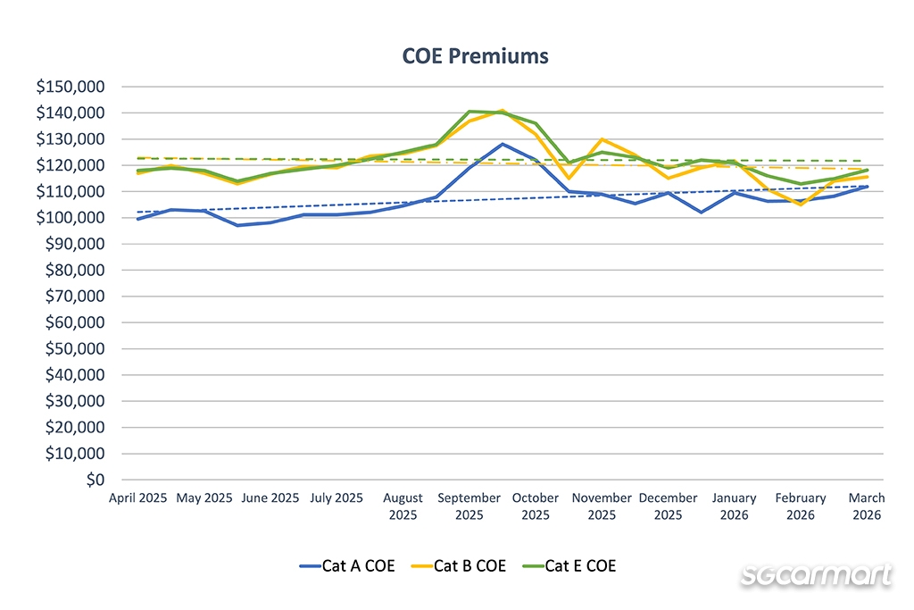 But don't be fooled into interpreting this as good news. It must be remembered that the last quarter of 2025 saw premiums scale incredible heights, with the first bidding session of October 2025 seeing Cat A reach its all-time high of $128,105 (Cat B and Cat E were no slouch too, at $141,000 and $140,009 respectively). The fact that premiums have fallen since is thus not to be uncritically celebrated. In fact, it's a shame that they haven't fallen even more.