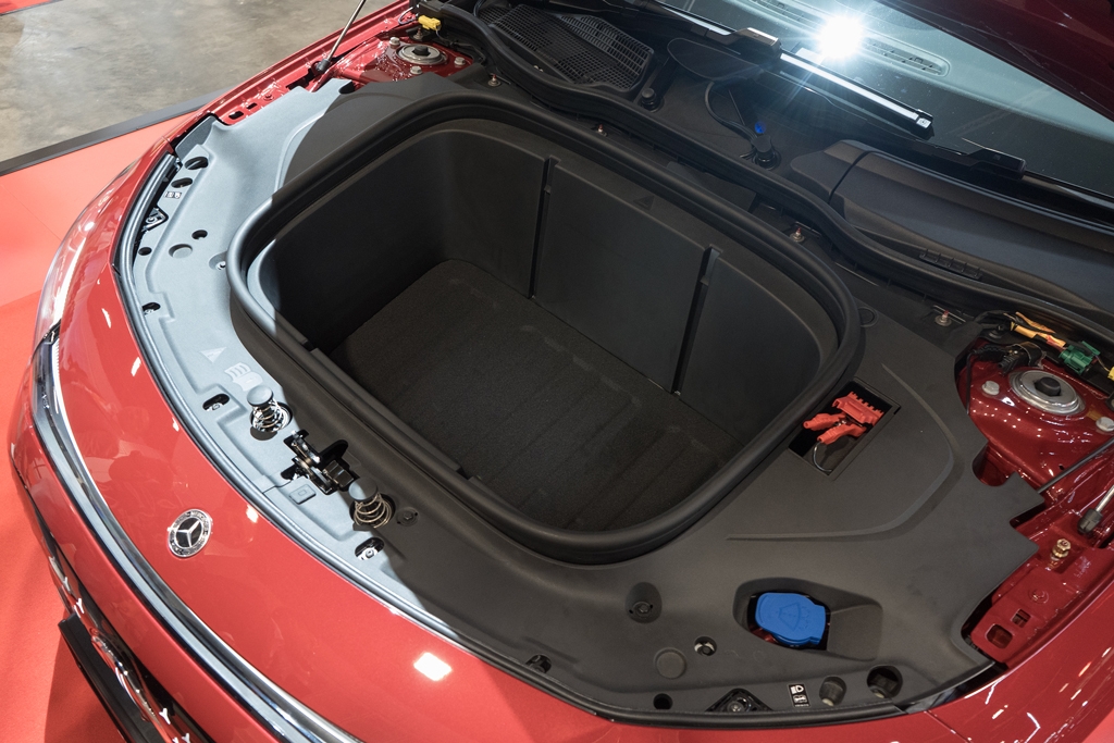 The new CLA can be equipped with a 14-inch screen for the front passenger, but for obvious reasons, the 101-litre frunk is only available in the electric model
