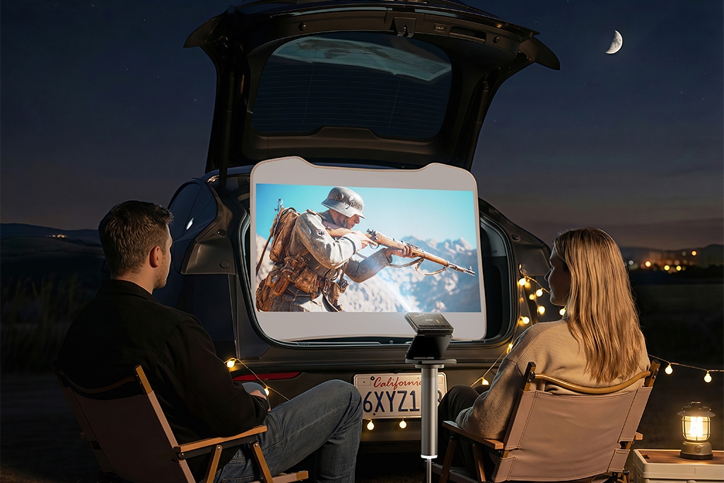 Rather than positioning projection as a fixed in-vehicle feature, Aurzen's setup frames the Zip Cyber Edition as a flexible companion for EV owners on the road. The compact projector is shown transforming a parked vehicle into a temporary cinema at outdoor destinations such as national parks, scenic overlooks, and campgrounds.