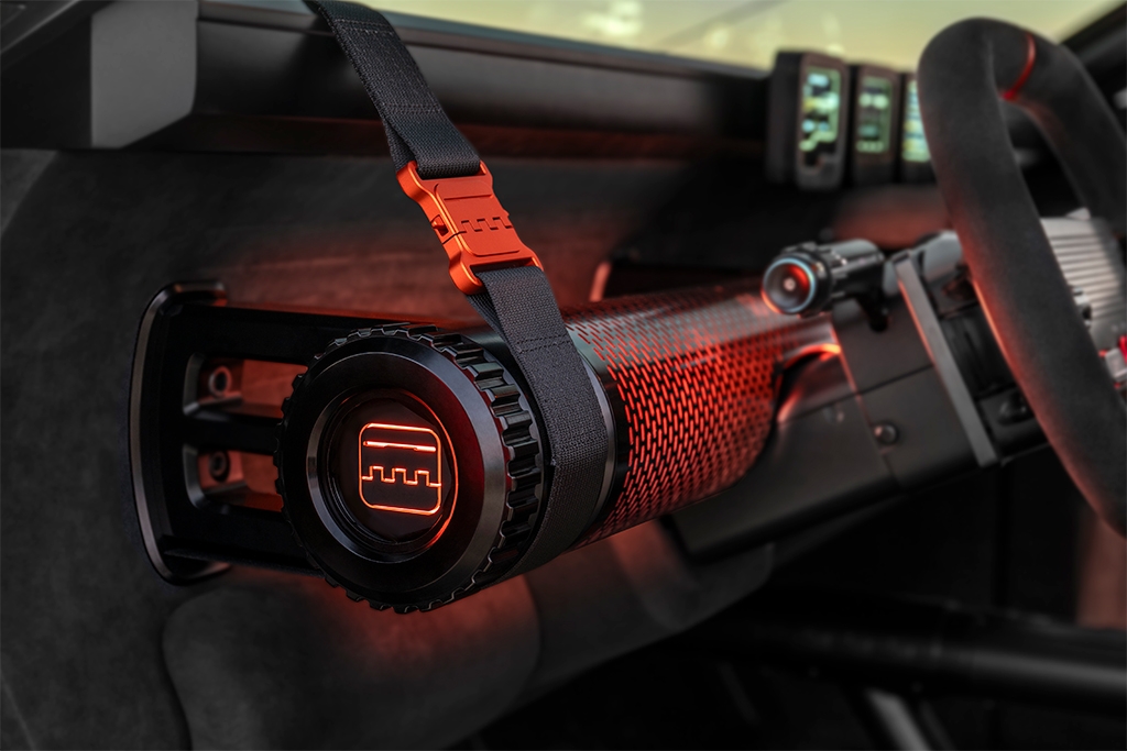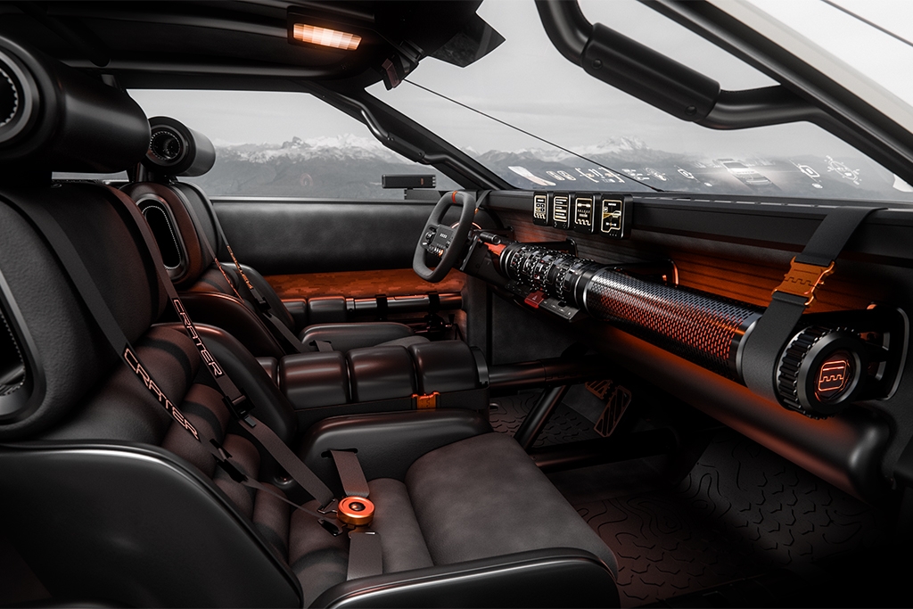 Inside, technical shapes are wrapped in soft-yet-durable materials. The concept's singular interior design starts with its high-brow crash pad, which bridges its exterior with its interior. The head-up display on the Crater Concept is a multi-function display that includes a rearview camera mirror feed. Structurally, a functional roll cage outlines the cabin, adding tension and strength, while integrated grab handles provide ease of entering and exiting.