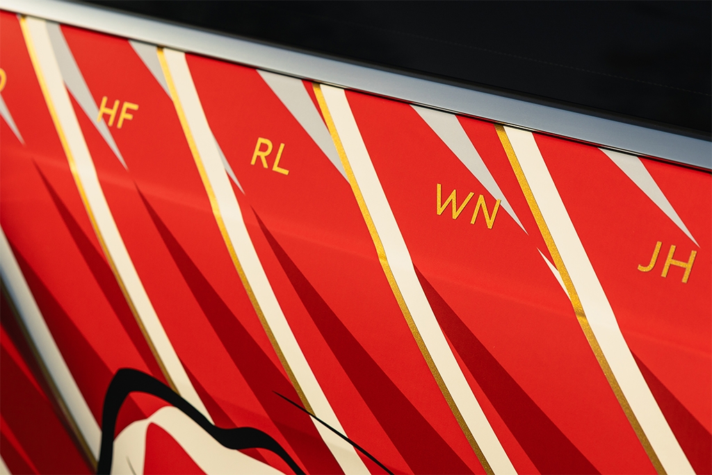 The final design is a Satin Artica White Bentayga EWB which features bold artistic artwork and metallic gold details. The side of the car features the silhouette of an aircraft, sat just behind the wing vent. Initials, in gold metallic, are placed on pillars to commemorate each of the 17 people lost. Finally, the number 85 features on the grille and bespoke poppy embroidery carry on the anniversary homage inside the car.