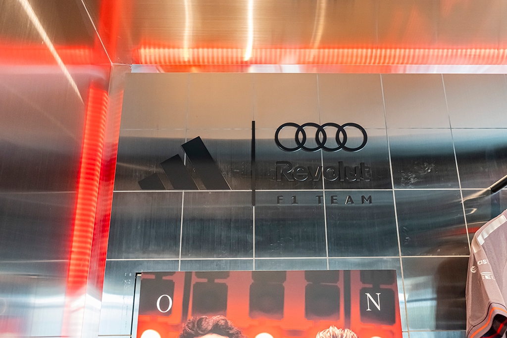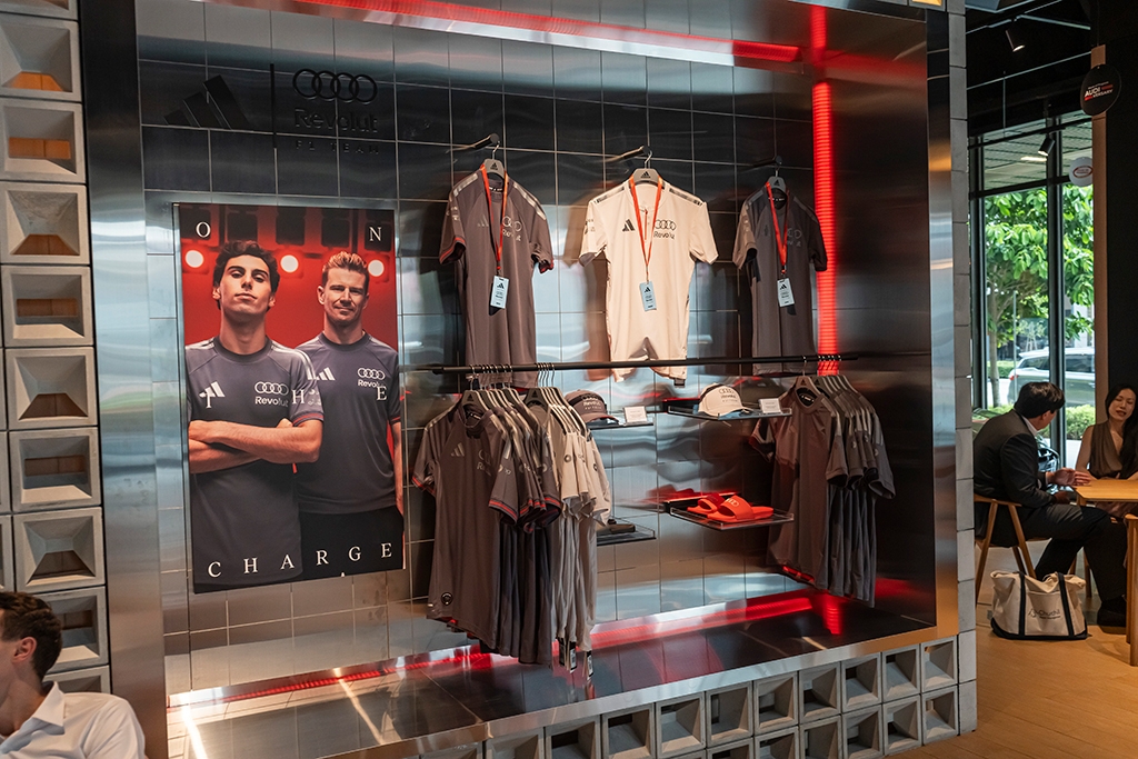 The space also hosts a region-first shop-in-shop concept carrying items from the brand new adidas x Audi Revolut F1 Team merchandise range