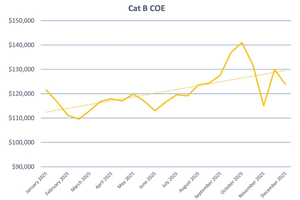Premiums for Cat A, for cars up to 1,600cc in engine capacity and with an output of no more than 130bhp or electric vehicles with a power output of up to 110kW, slipped yet again this session. Premiums slipped this session by $3,587 (3.3%) to reach $105,413.