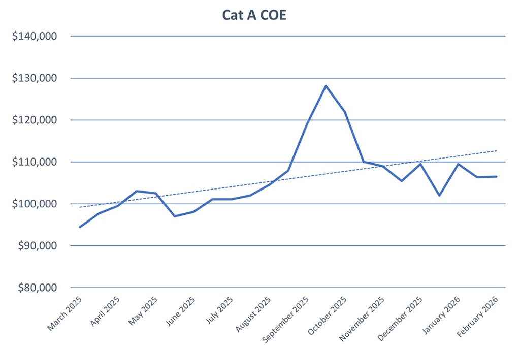 Premiums for Cat A have risen above those for Cat B in this COE bidding exercise. This unusual result comes amidst successive declines in Cat B premiums since the start of 2026, even as those in Cat A have continued to hold steady.