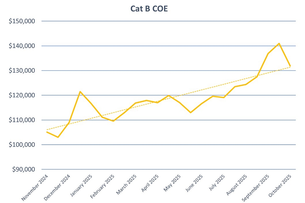 Premiums for Cat B, for larger cars with more than 130bhp or engine displacements larger than 1,600cc or electric vehicles with a power output of more than 110kW, slipped this session by $9,111 (6.5%) to reach $131,889. Premiums for the category have risen in the past five consecutive bidding sessions.