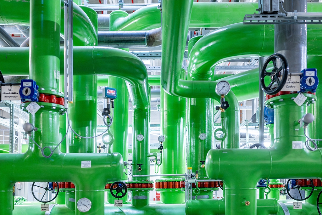 Meanwhile, the new Energy Centre is at the "heart" of the battery assembly plant, supplying it with electricity, cooling, heat, cooling water, and compressed air. In addition, waste heat from the production processes is used to heat the canteen, storage, and ancillary buildings at low temperatures. To do this, heat pumps in the Energy Centre convert the roughly 23°C chilled water heated by the production plants into heating energy at about 60°C.
