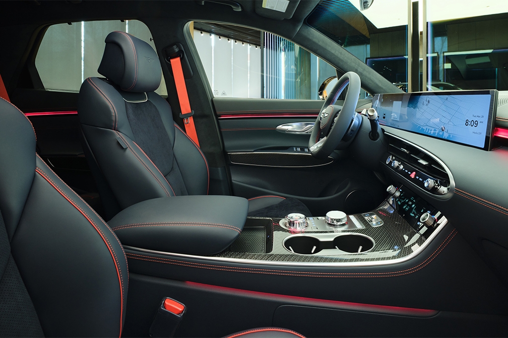 Inside, the GV70 Prestige Graphite features Nappa leather seating surfaces with suede inserts and headrest logo embossing. A new carbon fibre trims contributes to the cabin's aesthetic and also provides a striking visual contrast to the soft touch material.