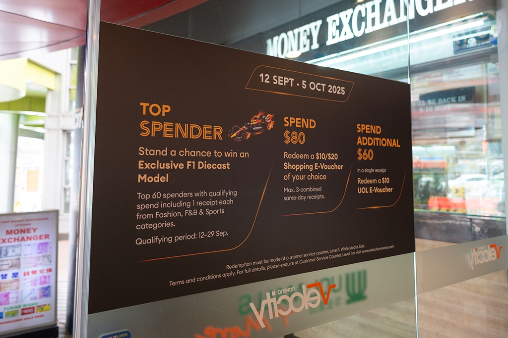 Top spenders from 12-29 September with receipts from fashion, F&B, and sports will qualify for a chance to win an exclusive F1 die-cast model as well! You can visit Velocity's official website for more detailed information and updates regarding the event.