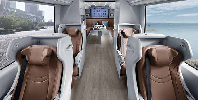 The personal workspaces in the middle are equipped with reclining seats, tables, wireless charging pads, individual entertainment systems and personal storage spaces to create a comfortable environment for work and relaxation in transit.
