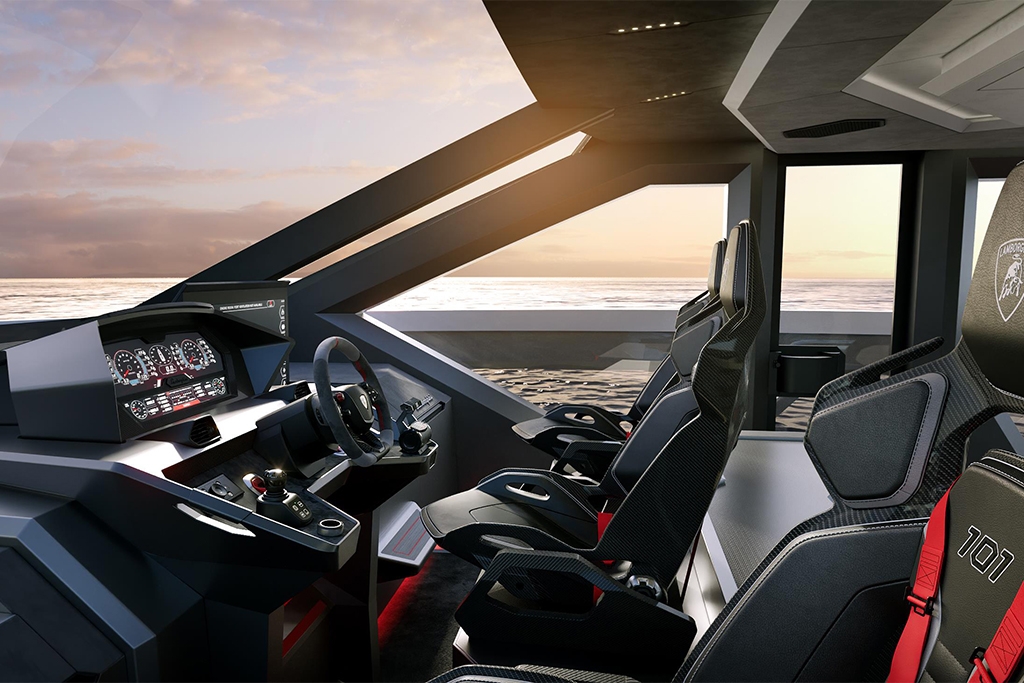 The yacht's helm station also draws inspiration from the Temerario, Lamborghini's V8 HPEV. Inside, the interior features iconic Lamborghini elements such as hexagons, clean lines, and the "Y" shape. The yacht is also spacious, and with three crew cabins, can also accommodate up to nine guests.