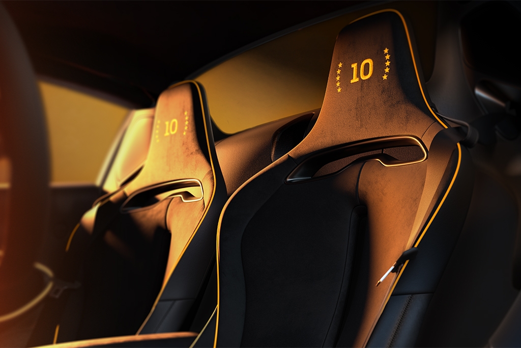 Alongside the unique vehicle exterior, MSO Bespoke interior details include unique "10" headrest embroidery in McLaren Orange and a Myan Orange Painted 12 o’clock steering wheel marker with "10" detail. Every car will also receive a Custom Casement Plaque on the centre console, underpinning the exclusivity of the car's specification. The interior specification of Performance Carbon Black Alcantara and Jet Black Nappa Leather with McLaren Vision Orange piping has also been selected to pair with these bespoke details.
