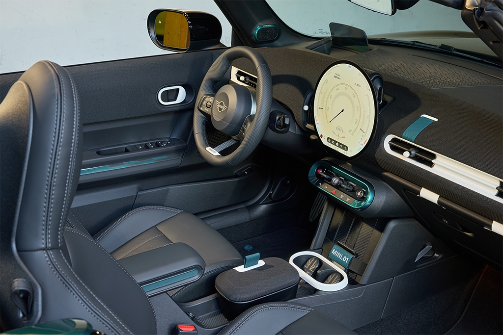 The soft top features a tonal Union Jack graphic, a nod to the vehicle's British roots and Plant Oxford heritage. Inside, the green colourway extends across more than 50 individually specified details, including a metallic, green-trimmed Harman Kardon speaker surround, custom door armrest overlays, a MINI.01 steering wheel badge, a personalised floor mat, and instrument cluster identifiers.