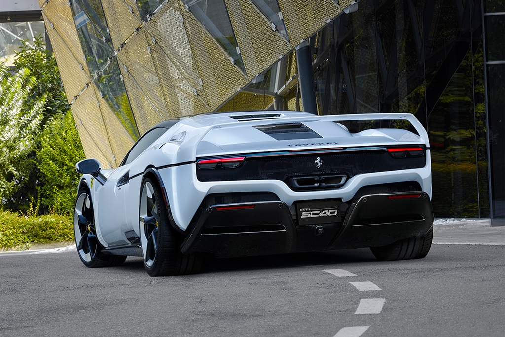 The car's name pays tribute to the F40, the legendary Ferrari supercar unveiled in July 1987. The SC40 echoes its sharp, angular lines, which are combined with softer surface transitions. Its proportions feature a long, low nose balanced by a short rear overhang and a high, fixed rear wing - painted in the car’s bespoke SC40 White - that flows from the body's flanks.