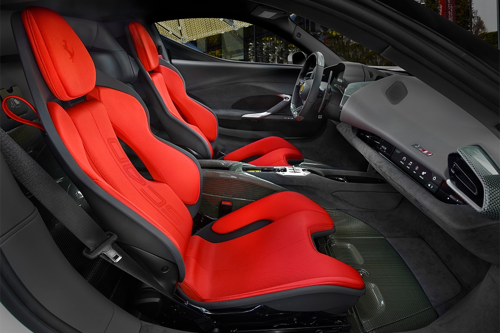 Inside, carbon-kevlar has been reinterpreted and features in the footwells, behind the seats, and on parts of the floor mats. This distinctive material is also used for the steering wheel, some dashboard inserts, the engine bay, and the luggage compartment. The upholstery features a combination of Charcoal Alcantara and a red Jacquard technical fabric, while the seats feature the woven SC40 logo and the Prancing Horse emblem on its headrests.