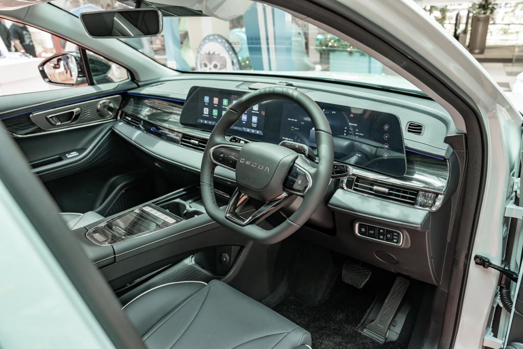 Here, you can discover the Omoda E5, a Cat A crossover with a distinctive coupe-like roofline. Swoopy lines aside, the car also boasts a high-tech cockpit that features the infotainment and instrument panels integrated into one sleek unit. Wireless Apple CarPlay and Android Auto are also standard.