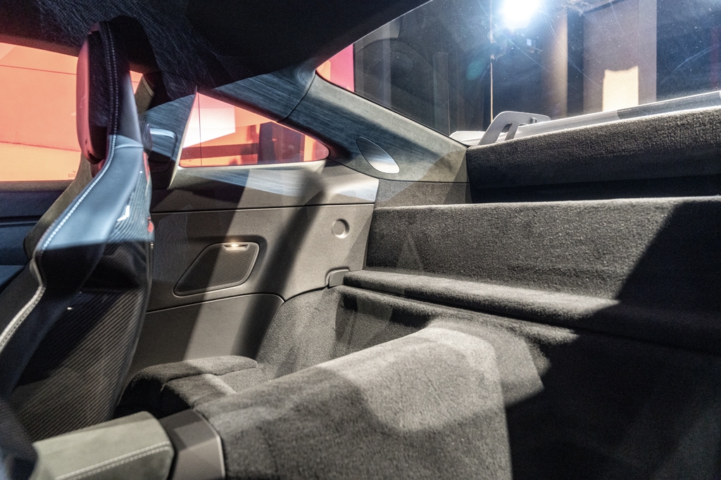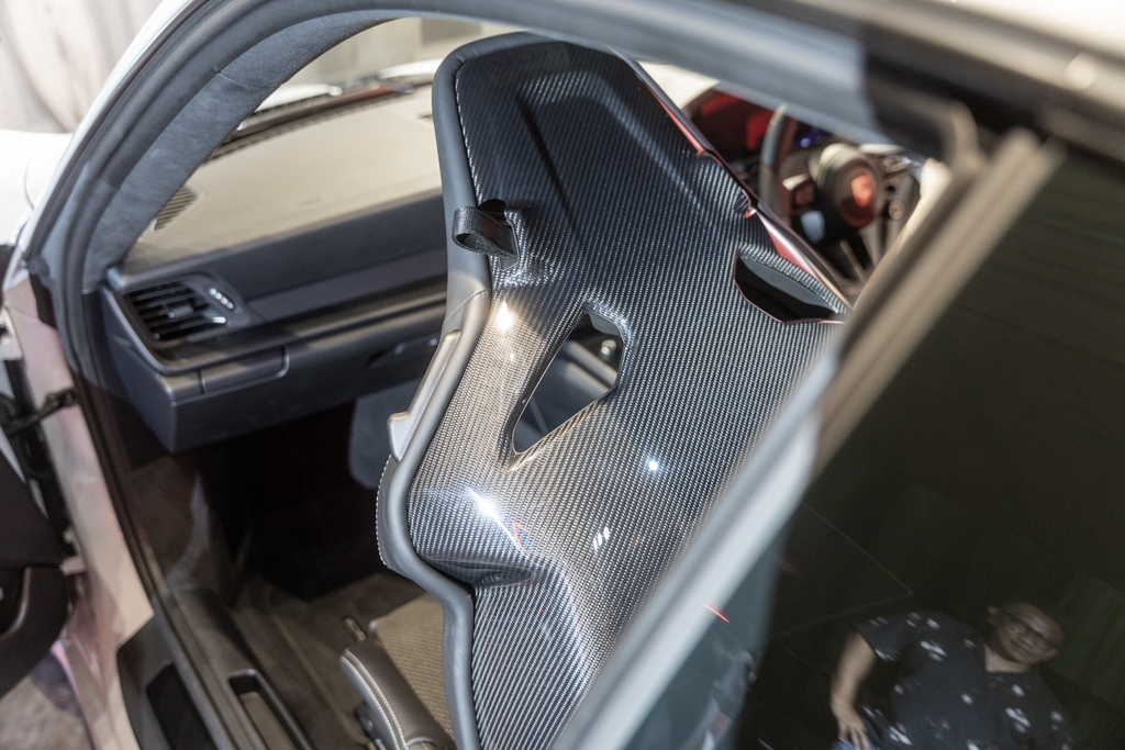The weight-reduction exercise can continue inside if clients specify the optional bucket seats with seat shells made from carbon fibre reinforced plastic (CFRP). Part of the headrest padding can be removed for track days to prevent the helmet from hitting the headrest. Another model first is the folding backrest, which enables drivers to access the optional rear seats, which are offered for the first time with the Touring package.