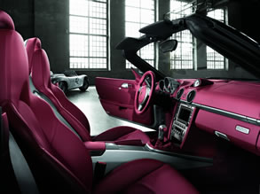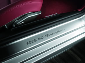 Inside, door trim strips made of stainless steel proudly bear the "RS 60 Spyder" model designation. The leather interior trim is further distinguished by a textured surface on the centre sections of the sports seats and the centre door linings, and this also extends to the steering wheel rim and handbrake lever. Completing the sporting ambience of course is a bespoke gear lever.