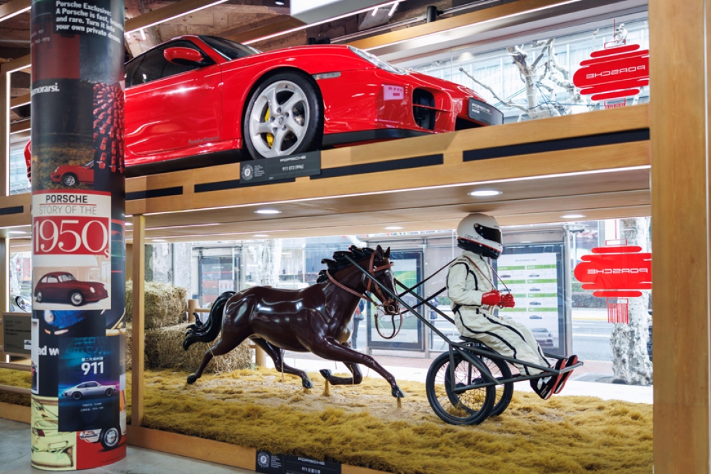 To showcase Porsche's brand identity and cultural significance through comprehensive experiential design, the ground floor first emphasises the company's racing legacy and vehicle history. Featured here are multi-level displays that honour the Porsche Museum, legendary race cars, and classic production vehicles that document the brand's development.