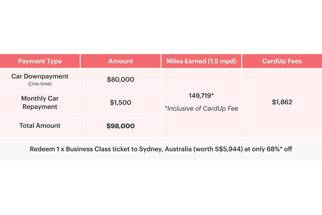 As for Car Down payment, with the code SGCARMART21, users can enjoy a low rate of 2.1% for the first $5,000. What this means is that if the downpayment is $100,000, the total admin fee will be $2,575, with a final charged amount of $102,575. On a credit card that earns 1.4 miles per dollar, users could earn approximately 143,605 miles from the transaction, potentially enough to redeem a Business Class ticket to Istanbul, Turkey, depending on the airline and redemption programme.