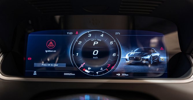 In place of the original F-TYPE's analogue tachometer and speedometer, is a 12.3-inch high-definition Interactive Driver Display that offers a choice of different display modes, with a large central rev counter being the default - truly befitting of a sports car.