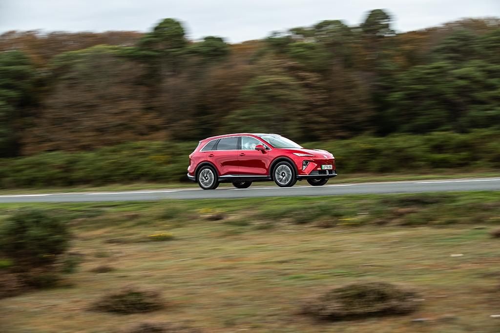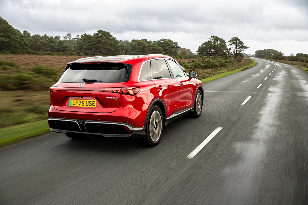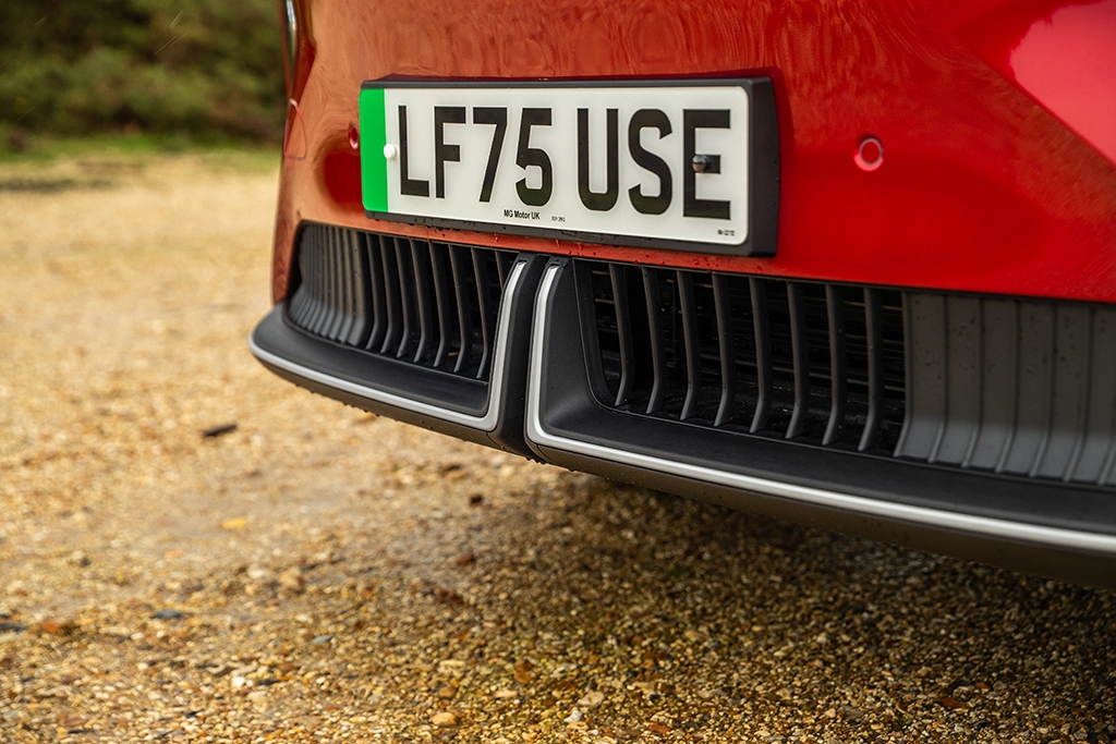 It sports an angular nose, sharp and narrow daytime running lights and even an Active Grille Shutter system to help with aerodynamic efficiency at speed. The rear is a slightly different affair, though, thanks to a thicker full-length light bar than the one on its smaller sibling, ending in vertical light pieces on both ends, as well as a chunky diffuser-esque bumper reminiscent of the MG 4 EV’s.