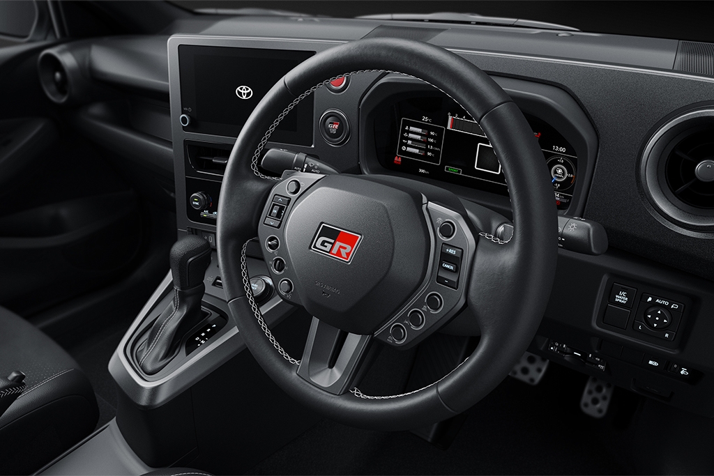 The Type 26 GR Yaris receives an upgraded steering wheel with a reduced diameter for improved response and grip, as well as new Bridgestone Potenza Race tyres as standard