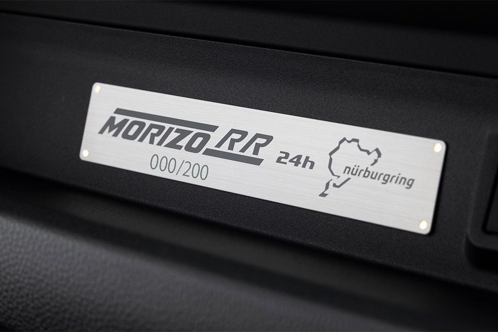 Exclusive interior features include the suede-surfaced steering wheel and an exclusive serial-number plate with a "Morizo RR" logo