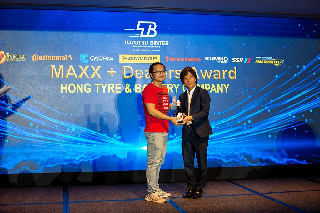 The penultimate awards presentation of the night saw the Maxx Plus Plaque, presented by Yuji Kimura, General Manager of Toyota Tsusho Asia Pacific, going to brands such as Hong Tyre & Battery Company, Khai Wah Battery & Tyre, L S Tyres & Automotive, Tom's Tyre, and Tyres Online SG.