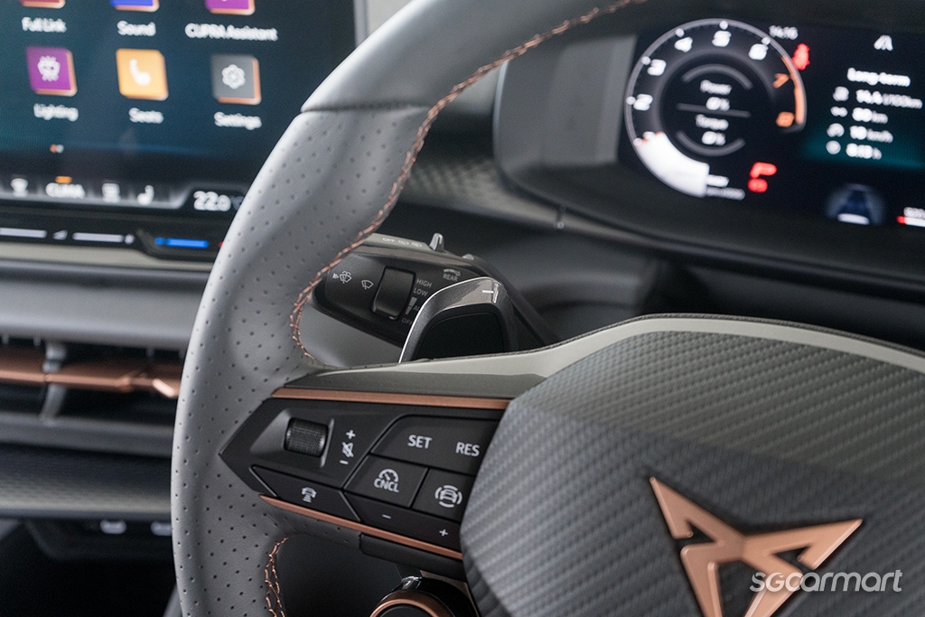 What the eye-catching elements may obscure initially, however, is how solidly-built this interior feels, deferring neither to hard plastics nor to black gloss. With its plethora of physical controls, navigating the Terrama's dashboard takes minimal effort too. This may be our favourite Cupra steering wheel in recent memory, dotted with sensibly labelled buttons, and set against a generously-sized 10.25-inch digital instrument cluster with configurable, driver-focused layouts. (The latter feels undeniably superior to the small panels found on the Born and Tavascan).