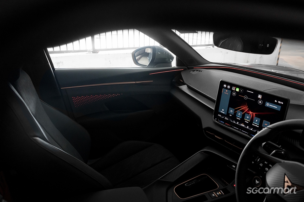 There are eye-catching lashings of copper all over, for instance, while ambient lighting is done in a manner cohesive to the car's aggressive whimsy, with arrow-shaped perforations in the door cards rather than run-of-the-mill light strips. Cupra's sustainable intentions are even easy to appreciate with those Dinamica fabric sports seats, which offer excellent lumbar support.