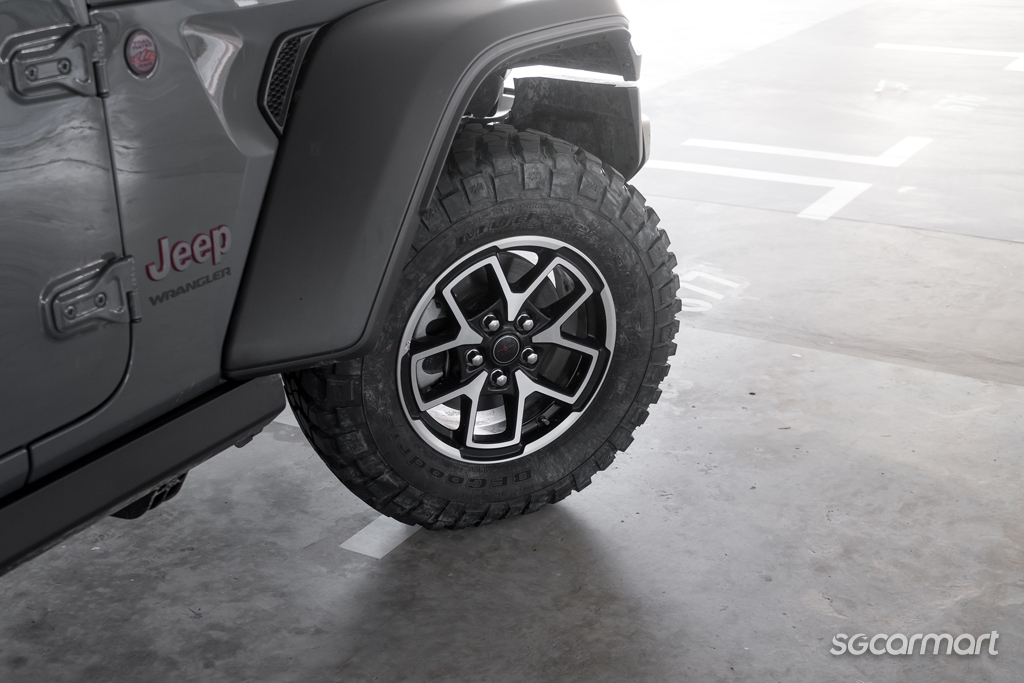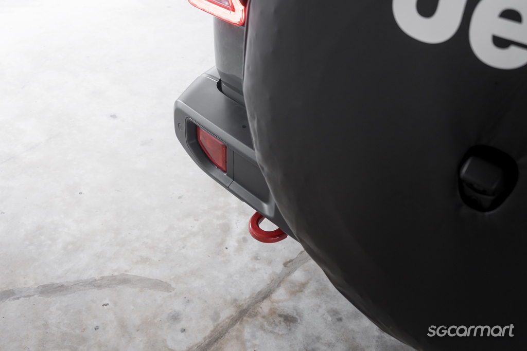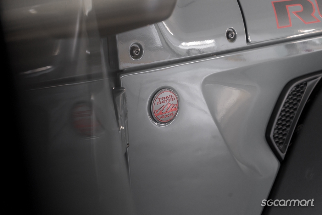 Bold lettering on its bonnet aside, the Rubicon also sets itself from the entry-level Sahara with its offroad tyres and a red tow hook