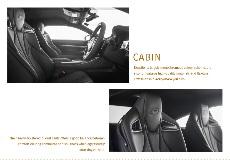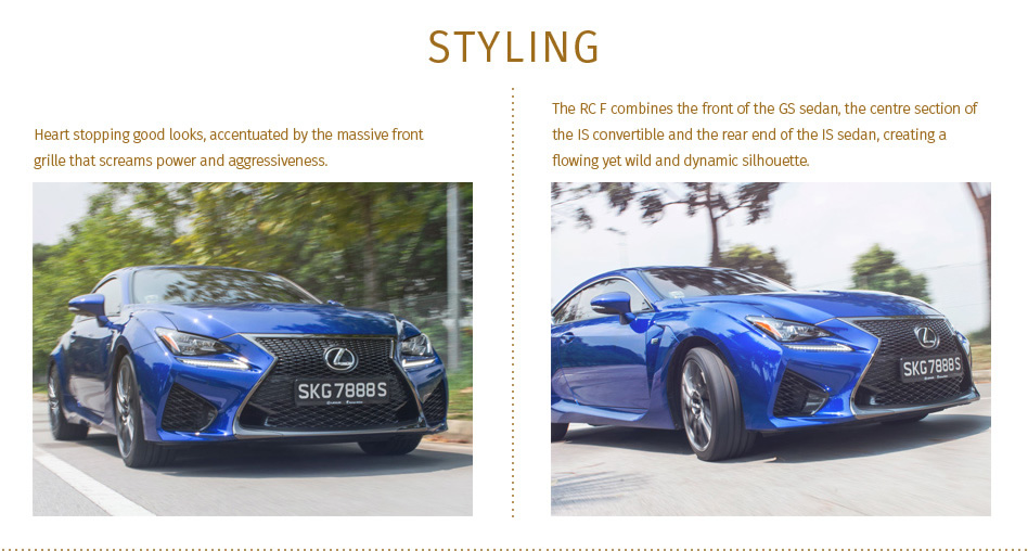 One of the most striking aspects of the RC F is its antagonising good looks, with a larger-than-life grille, bulged bonnet, flared fenders and gigantic air intakes. The RC F is a sight to behold on the roads, no matter which angle you are looking at it from. Despite its flashy and monstrous appearance, the flowing lines provide the car with a cohesive appearance.