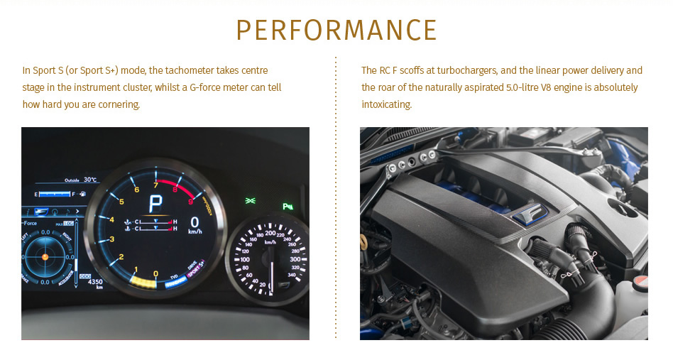 Despite being fairly new to the segment, the Lexus RC F is an aggressive, muscular and exciting premium performance coupe that holds its own in a segment typically dominated by the Germans.