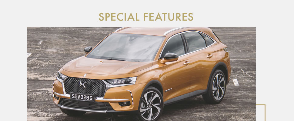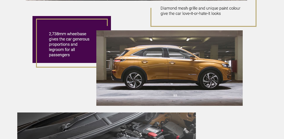 Look closer and you'll quickly realise the car expresses itself as a unique offering design-wise. With a diamond-shaped mesh grille that matches the design of the taillights, LED headlamps that comprise of three squarish blocks that swivel as you unlock the car, and a vivid DS-signature gold coloured paint finish, the DS 7 Crossback looks anything but regular.