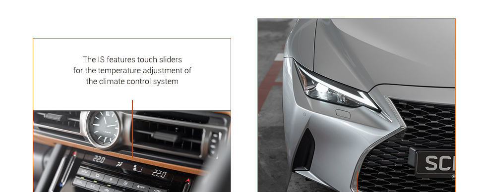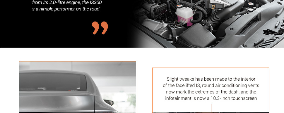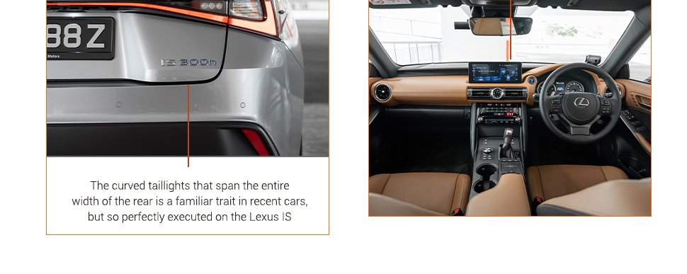 Right from the first glance you take at the IS, you'll notice its sportier stance - indeed, at 4,705mm x 1,840mm x 1,435mm (L x W x H), it sits lower and wider than its predecessor. Up front, an aggressive grille takes centrestage, flanked by restyled headlamps that fit snugly among the stylish creases to create a sleek front end. Lexus' designers didn't just leave it at that, the rear now sports a set of curved taillights that span the width of the body.