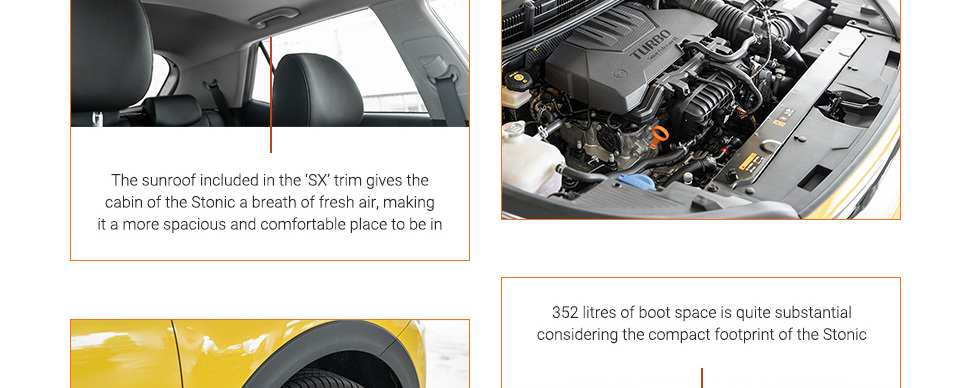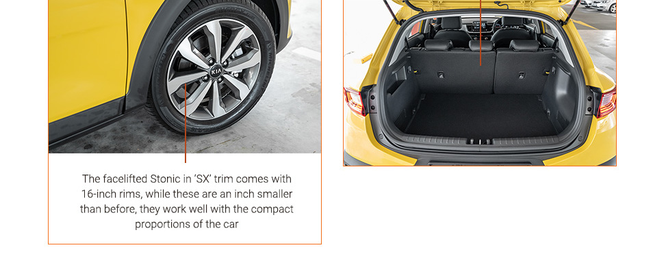 While the Stonic's by no means a large car, don't let its compact footprint fool you. Thanks to the strong-looking and blocky greenhouse, there's more headroom than one would expect from something its size, and it is further aided by clever little cutouts in the headliner. In fact, you'll be able to sit four in comfort, along with 352 litres of storage space at the rear.