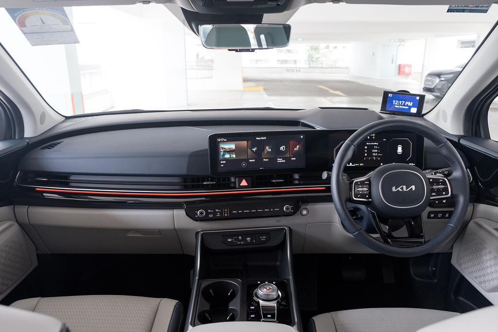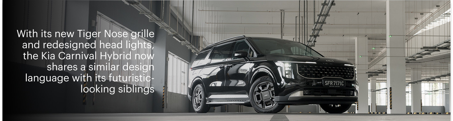 With its massive new 'Tiger Nose' grille, framed by LED strips that traces the squarish bonnet and hugging its angular-shaped main beams, the handsome new Carnival Hybrid is easy to identify. Afterall, its design language has now been updated to match the futuristic looking siblings in Kia's stable, such as the EV9 and Sorento Hybrid.
