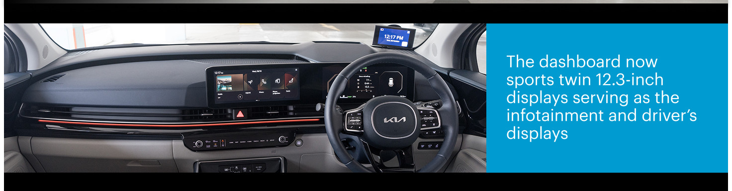 Inside, the Carnival Hybrid has received a modern refresh, now featuring a single panel that houses twin 12.3-inch displays on the dashboard, replacing the analogue gauges that the pre-facelift had. It also comes with Kia's intuitive switchable LCD control panel that alternates between climate control and media control functions at the touch of a button.