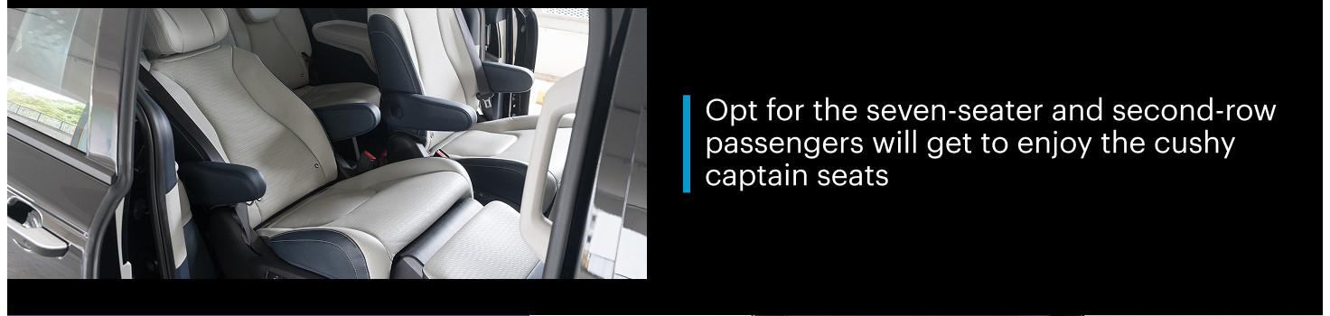 With the seven-seater variant, you'll get cushy captain chairs on the second row, while still having sufficient aisle space between to get to the useable last row with plentiful legroom - even for adult occupants. With its 627-litre boot, the Kia Carnival is perfect for a family of seven and two to three full-sized luggage.