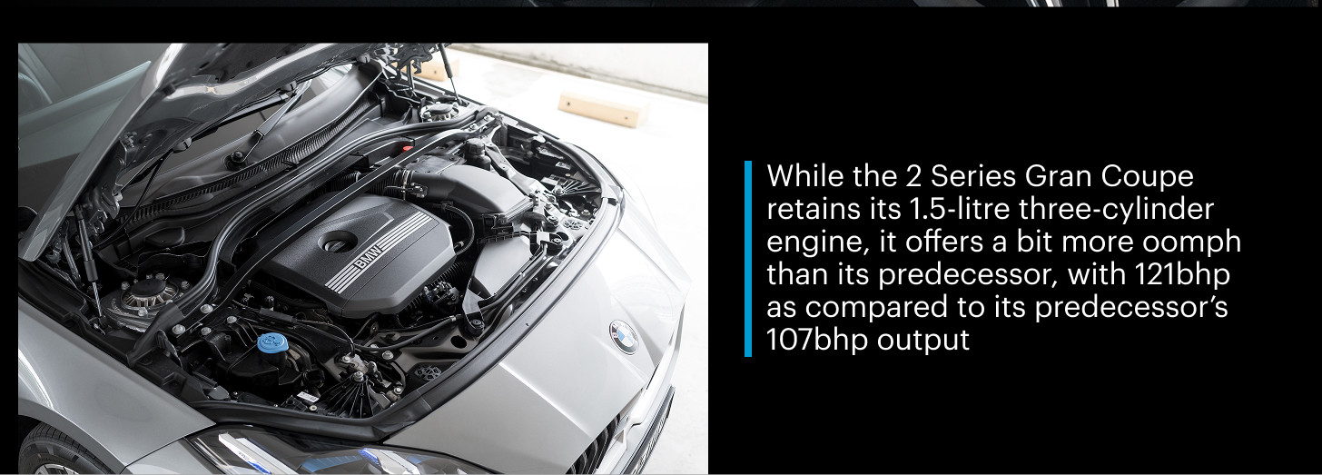 And while it retains its 1.5-litre, three-cylinder engine, this 2 Series Gran Coupe now puts out a total of 121bhp, as compared to its predecessor's 107bhp, ensuring it doesn't feel strained when keeping up with traffic.