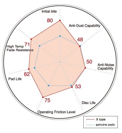 - The above chart represents evaluation values of our product in 100 phases in comparison with genuine pads of the test model. Values of genuine pads show 50.