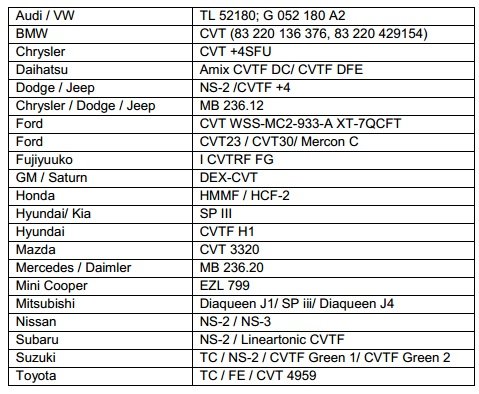REV-1 CVT Fluid is strongly recommended for all CVT-equipped passengers vehicles except for hybrid CVT units of Toyota and Ford. It is also suitable for use in the following models, makes, part numbers mentioned here below: