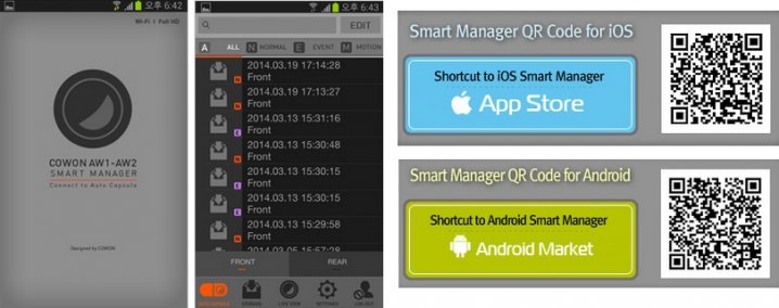 Wireless Technology for Freedom and Convenience - Smart Manager Application SupportedSmart Manager is an application that links Cowon AW2 to various smart devices such as Android and iOS smart phones and tablet PCs. With the Live View function of Smart Manager, you can view in real-time videos being recorded by the front and rear view cameras. You can also view and download videos recorded by AW2. Wireless real-time settings and firmware upgrade are supported to increase your convenience.