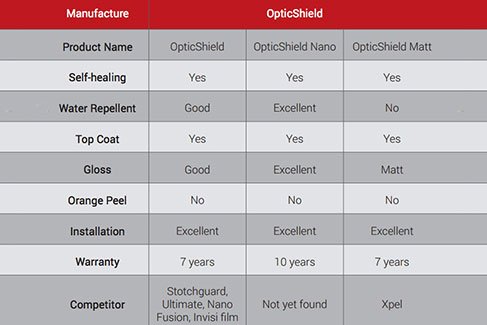 OpticShield Paint Protection Film combines best-in-class durability and clearness not previously available in the market. Our films is hydrophobic, self-healing, anti-contamination, anti-yellowing. No other conventional films will have such abilities or are limited to only having one functionality. In addition, the clear film employs special elastomeric polymers that "self-heal", thus eliminating swirl marks and other fine scratches without you having to do anything.
