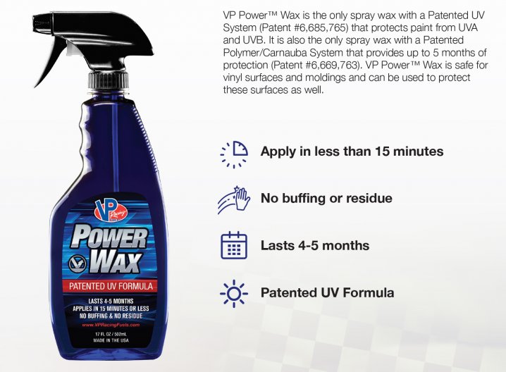 VP Power Wax is the only spray wax with a Patented UV System (Patent #6,685,765) that protects paint from UVA and UVB. It is also the only spray wax with a Patented Polymer/Carnauba System that provides up to 5 months of protection (Patent #6,669,763). VP Power Wax is safe for vinyl surfaces and moldings and can be used to protect these surfaces as well.