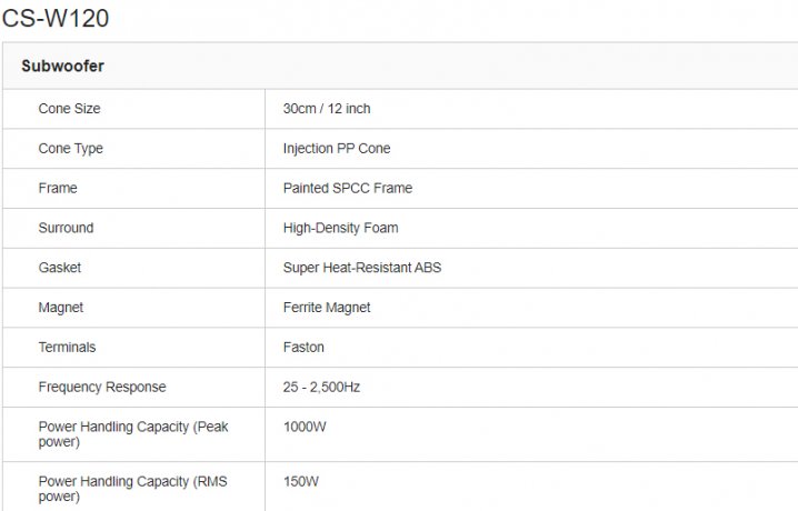 The CS-W120 houses a 21.30 oz magnet to make up its drive, delivering a peak power of 1000W.
